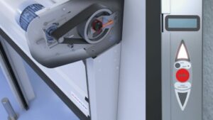 Opening of the uprights from the inside, facilitating access to the built-in control box for maintenance.