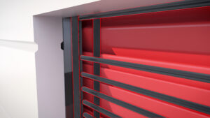 The patented system of flexible guides tensioned inside the uprights cushions the stiffeners of the curtain, which avoids the mantel causing noise pollution in windy conditions.